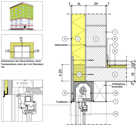 Fenstersturz mit Rollladenkasten, Fenster in Dämmebene, normale Bewitterung, mit Sturzschutz